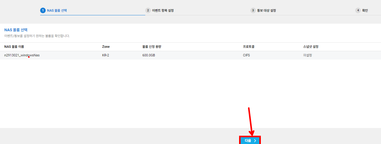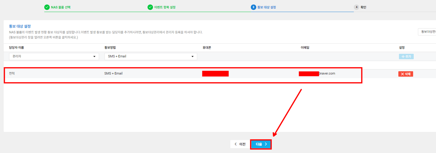 다음과 같이 이벤트 통보 대상을 지정합니다. [SMS + Email]로 설정한 후 [다음]을 눌러줍니다.