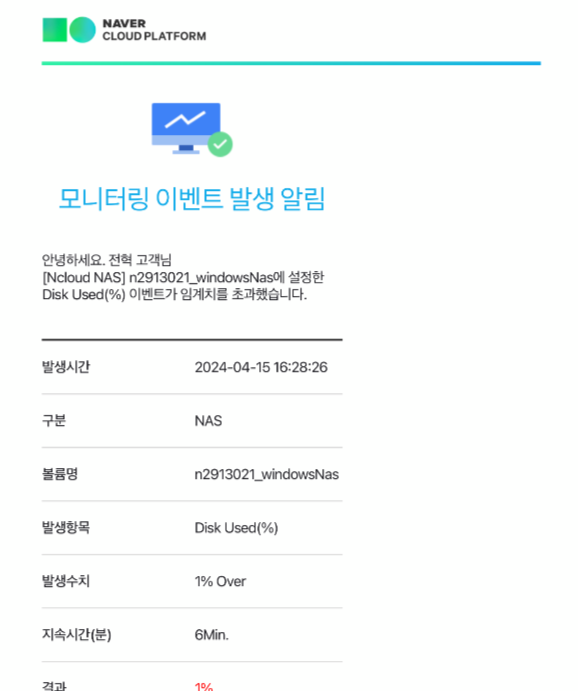 생성된 볼륨의 디스크 사용량을 모니터링할 수 있으며, 모니터링 기능을 기반으로 디스크 사용량에 대해 이벤트를 설정할 수도 있습니다. NAS 볼륨에 대해 디스크 사용량 임계치와 통보 대상자를 설정하면 임계치 초과 시 이벤트 상황이 통보 대상자의 SMS 또는 이메일로 통보됩니다.