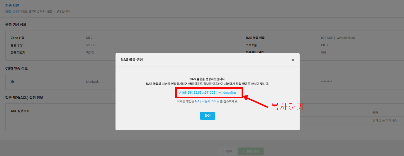 설정 정보를 검토한 후 [볼륨 생성] 버튼을 누르면 다음과 같이 마운트 정보가 표시되는데 해당 정보를 복사해 둡니다.