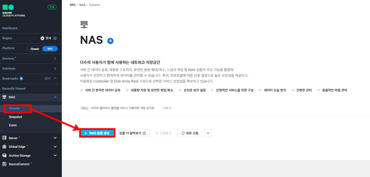 스토리지 생성을 위해 NAS - Volume - [NAS 볼륨 생성] 버튼을 눌러줍니다.
