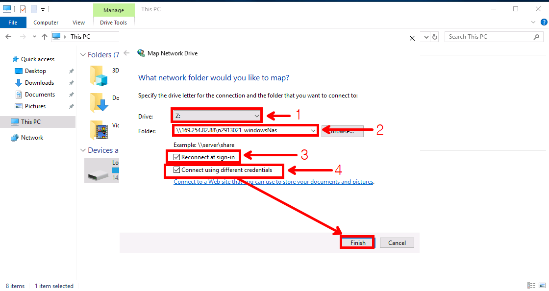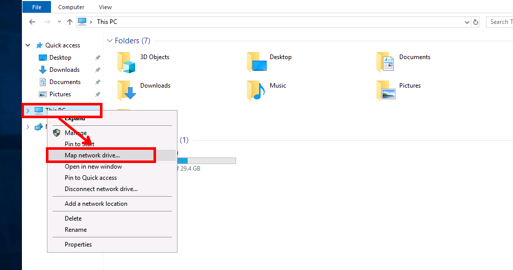 [This PC]를 우클릭한 후 [Map network drive...]을 선택합니다.
