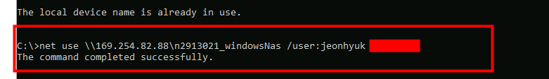다음과 같이 net use로 입력하여 외부 네트워크에 있는 NAS 스토리지에 연결합니다.