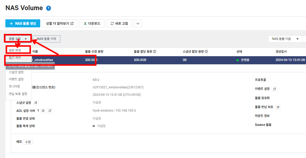 다음과 같이 볼륨 용량을 증설할 스토리지를 선택한 후 [볼륨 설정] - [용량 변경]을 선택합니다.