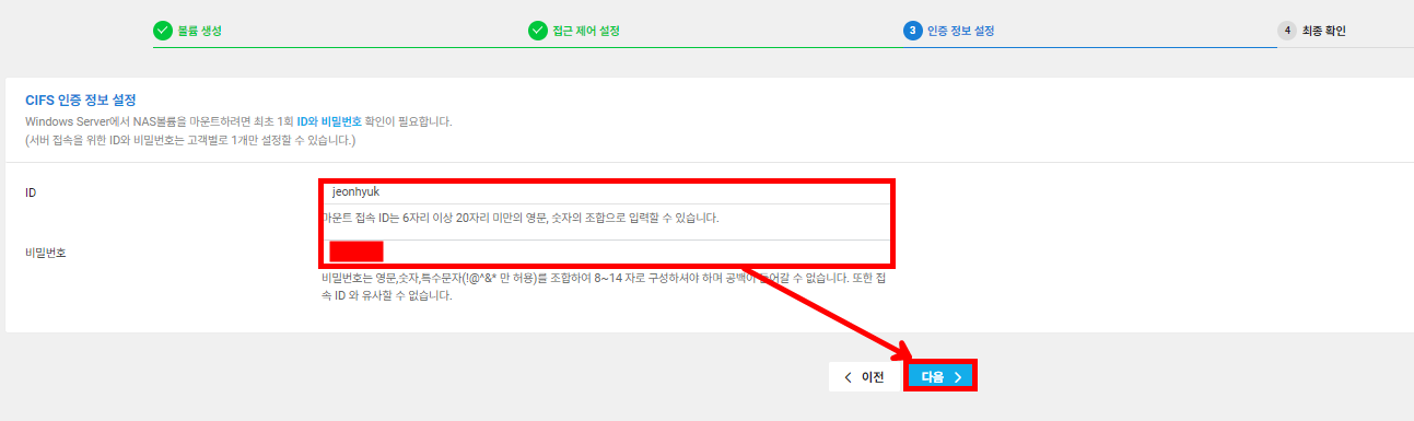 Windows Server에서 NAS 볼륨을 마운트 하려면 인증 정보가 최초 1회 필요한데 CIFS 인증 정보 설정을 합니다.
