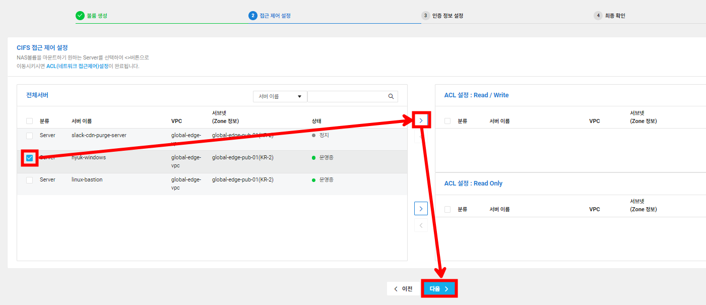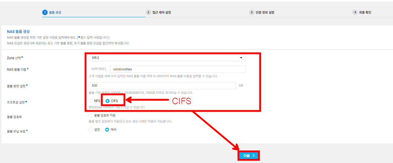 볼륨을 생성할 수 있는 최소한의 용량인 500GB로 설정하고 윈도우 시스템이기 때문에 CIFS를 사용합니다.