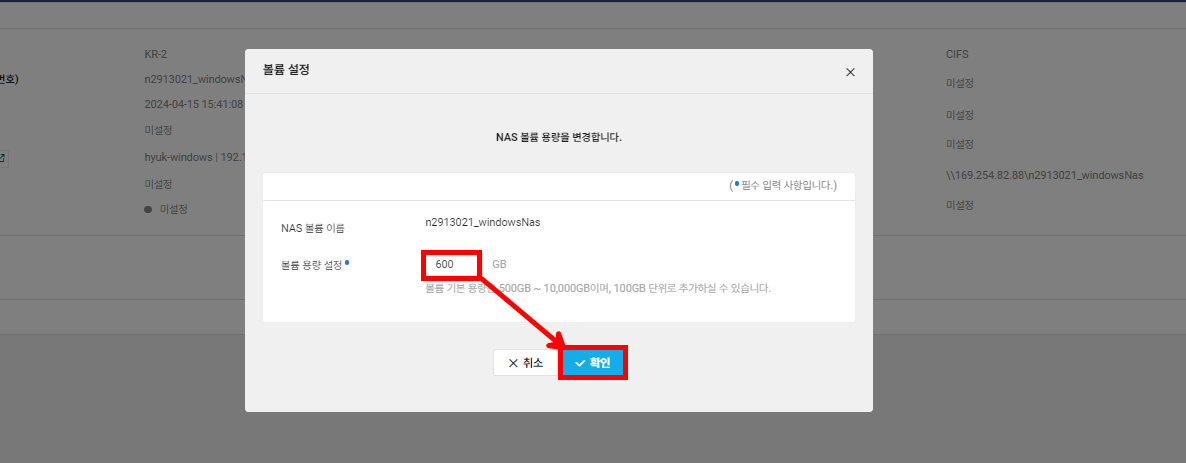 볼륨 용량을 500GB에서 600GB로 증설한 후 [확인]을 눌러줍니다.
