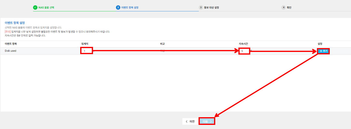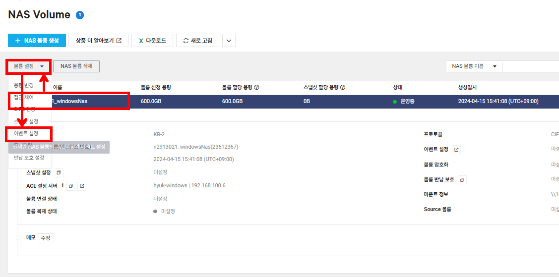 이벤트를 설정할 스토리지를 선택한 후 [볼륨 설정] - [이벤트 설정]을 통해 이벤트를 설정합니다.