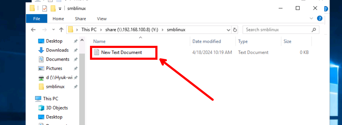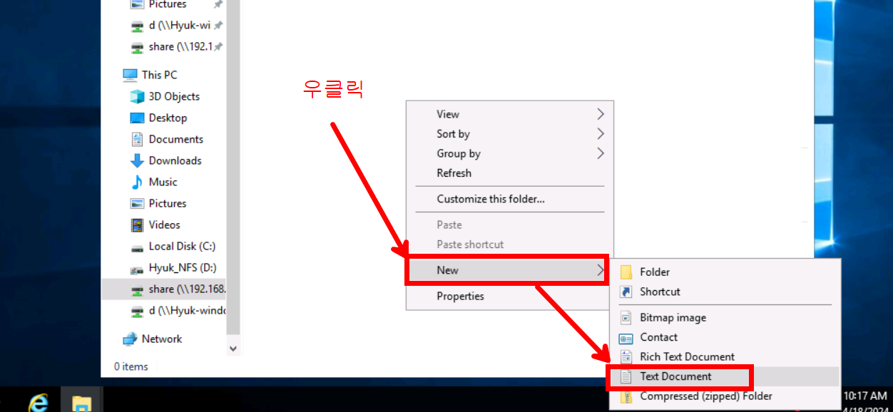 Samba 서버에 정상적으로 접속된 것을 확인할 수 있습니다. 아까 공유 폴더 설정 시 writable 옵션을 yes로 주었기 때문에 파일을 하나 생성해 보겠습니다. 빈 공간을 우클릭하신 후 [New] - [Text Document]를 클릭합니다.