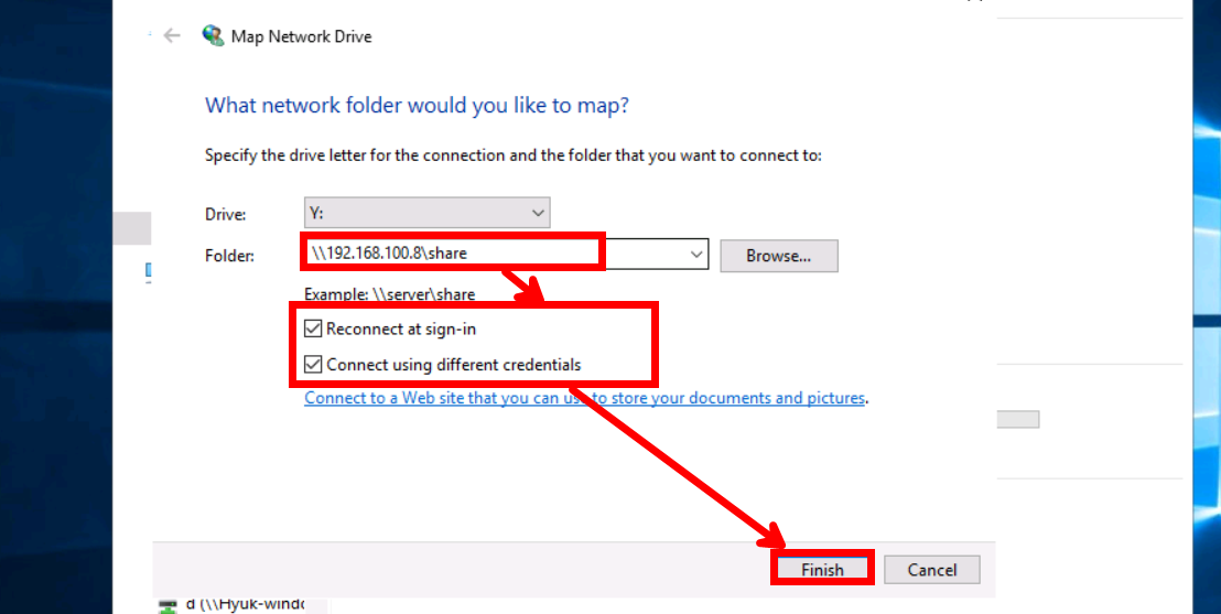 다음과 같이 설정한 후 [Finish]를 눌러주면 Samba 인증 정보를 입력하라는 화면이 나오는데 입력해 주세요.