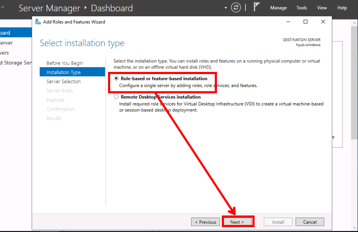[Role-based or feature-based installation]을 선택한 후 [Next]를 눌러줍니다.