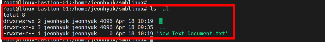리눅스 서버의 공유 폴더에서 정상적으로 파일이 생성된 것을 확인할 수 있습니다.