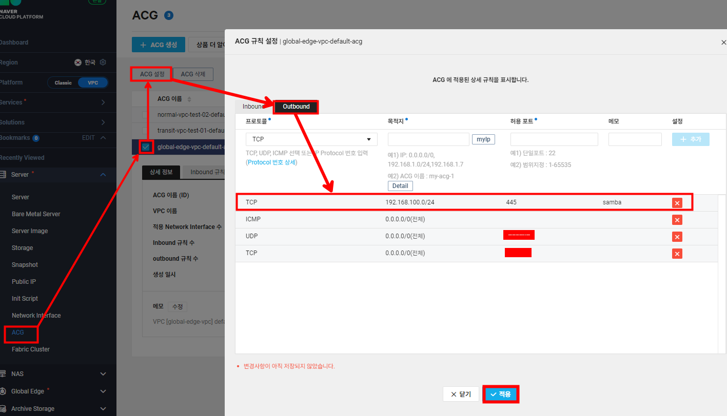 저는 윈도우 서버와 리눅스 서버가 같은 ACG를 사용하고 있지만 실제로 다른 ACG가 적용될 것이기 때문에 리눅스 서버 ACG에서는 Outbound로 445 포트를 허용해주어야 합니다.