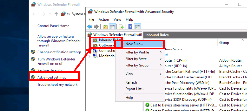 좌측 탭에 [Advanced settings]가 있는데 Inbound, Outbound Rule을 추가하는 항목이 있습니다. 우클릭 후 [New Rule]로 445 포트를 Inbound에 추가해주시면 됩니다.