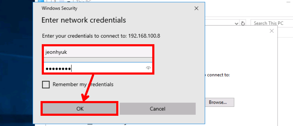 앞에서 Samba 계정에 추가할 때 생성했던 인증 정보를 입력해 주시면 됩니다.