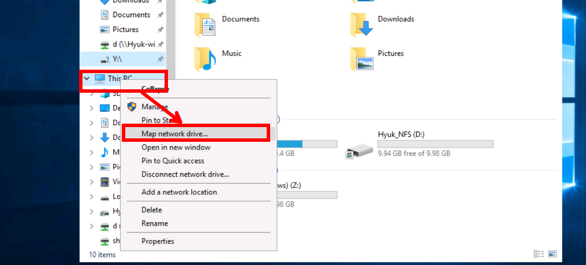 [This PC]를 우클릭 후 [Map network drive]를 선택합니다.