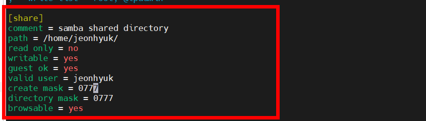 | valid users | (id1, id2, id3...) | 공유 폴더 접근 권한 유저 |