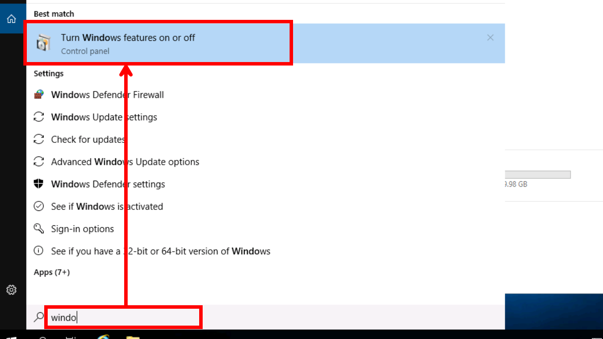 윈도우 검색 창에 [Turn Windows features on or off]를 검색한 후 선택합니다.