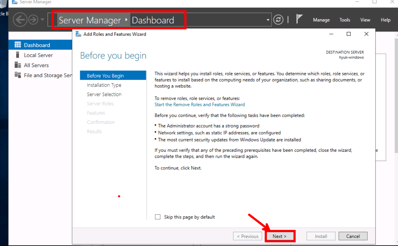 Server Manager가 바로 실행되는데 [Next]를 눌러줍니다.