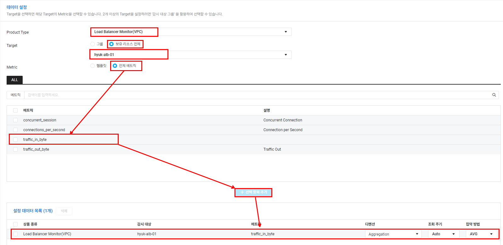 전체 메트릭을 선택하면 아까 보였던 메트릭 외에도 [traffic_in_byte] 항목을 확인할 수 있습니다.