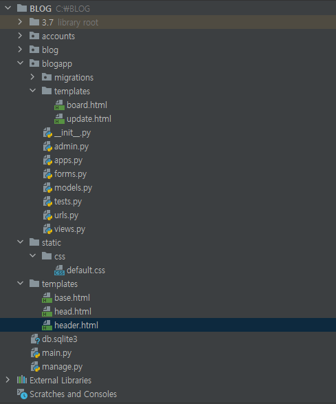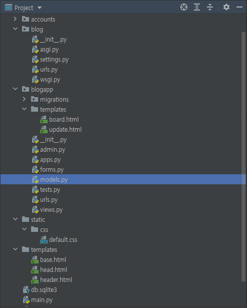 현재 `blog`라는 프로젝트를 만들고 `blogapp`, `accounts` 앱을 프로젝트에 등록해둔 상태입니다.