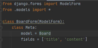 3. BoardForm 클래스는 Board 모델과 연결되는 폼입니다. Meta 클래스를 사용하여 폼의 속성을 정의합니다.