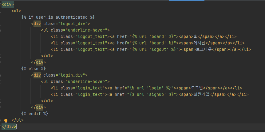 따라서 {% if user.is_authenticated %}는 현재 로그인한 사용자가 인증되었으면 조건이 참이 되어 해당 블록 내의 코드를 실행하고, 그렇지 않으면 조건이 거짓이 되어 해당 블록을 무시하고 넘어가는 역할을 합니다.
