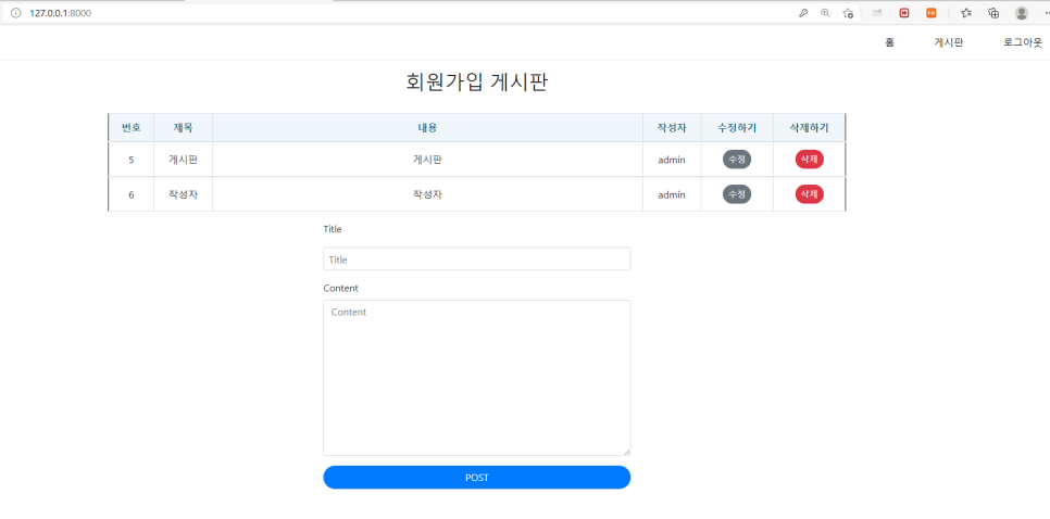 오른쪽 상단에 메뉴 팝업이 로그인 전에는 로그인과 회원가입이었는데 로그인한 후에는 홈, 게시판, 로그아웃으로 바뀐 것을 확인할 수 있습니다. 이것은 header.html에서 템플릿을 수정해주었기 때문입니다.