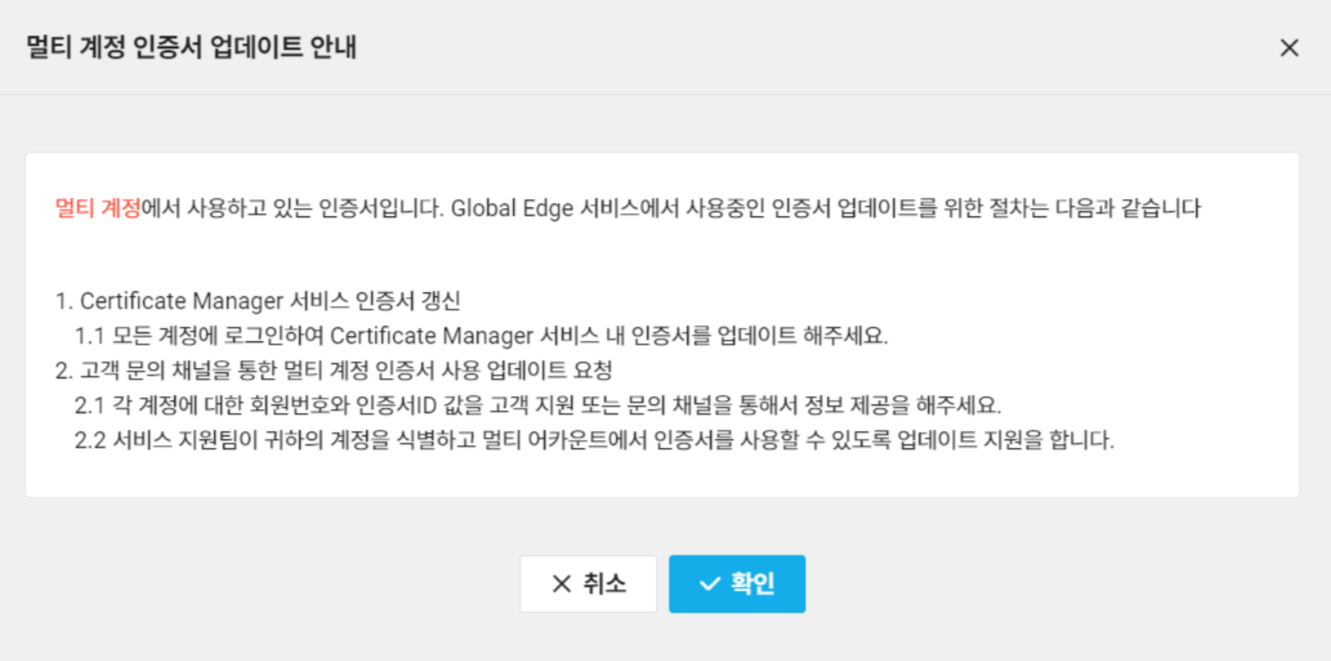 업데이트 버튼을 누르면 다음과 같이 멀티 계정 인증서 업데이트 안내 화면이 나옵니다. 현재 멀티 계정에 대한 인증서 업데이트는 기능이 추가된 지 얼마 되지 않아 콘솔상에서 해당 기능을 사용할 수 없습니다.