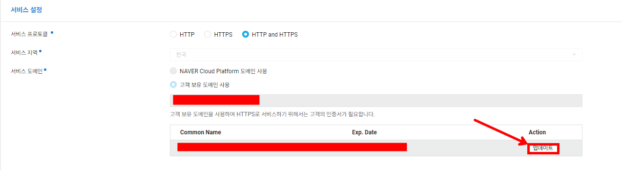 다음과 같이 기존 SSL 인증서로 인증이 되어 있고 Expire Date가 표시되는 것을 확인할 수 있습니다. 우측에 [업데이트] 버튼을 눌러줍니다.