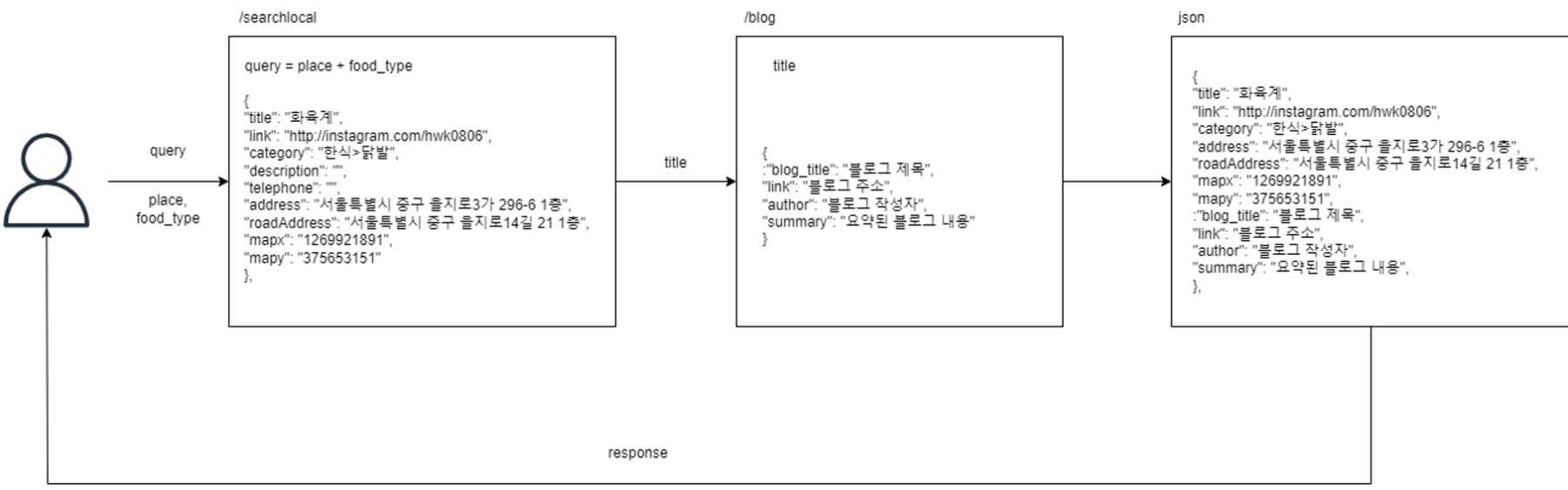 서비스에는 Naver Developer API를 사용하였습니다. 그중에서도 /searchlocal과 /blog API를 이용하여 지역과 음식 종류에 해당하는 맛집을 찾아낸 후 블로그 API를 통해 맛집 리뷰에 대한 블로그 콘텐츠를 받아옵니다.