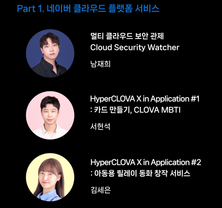 Part 1에서는 네이버 클라우드 서비스인 Cloud Security Watcher와 HyperCLOVA X in Application 발표가 진행되었습니다.