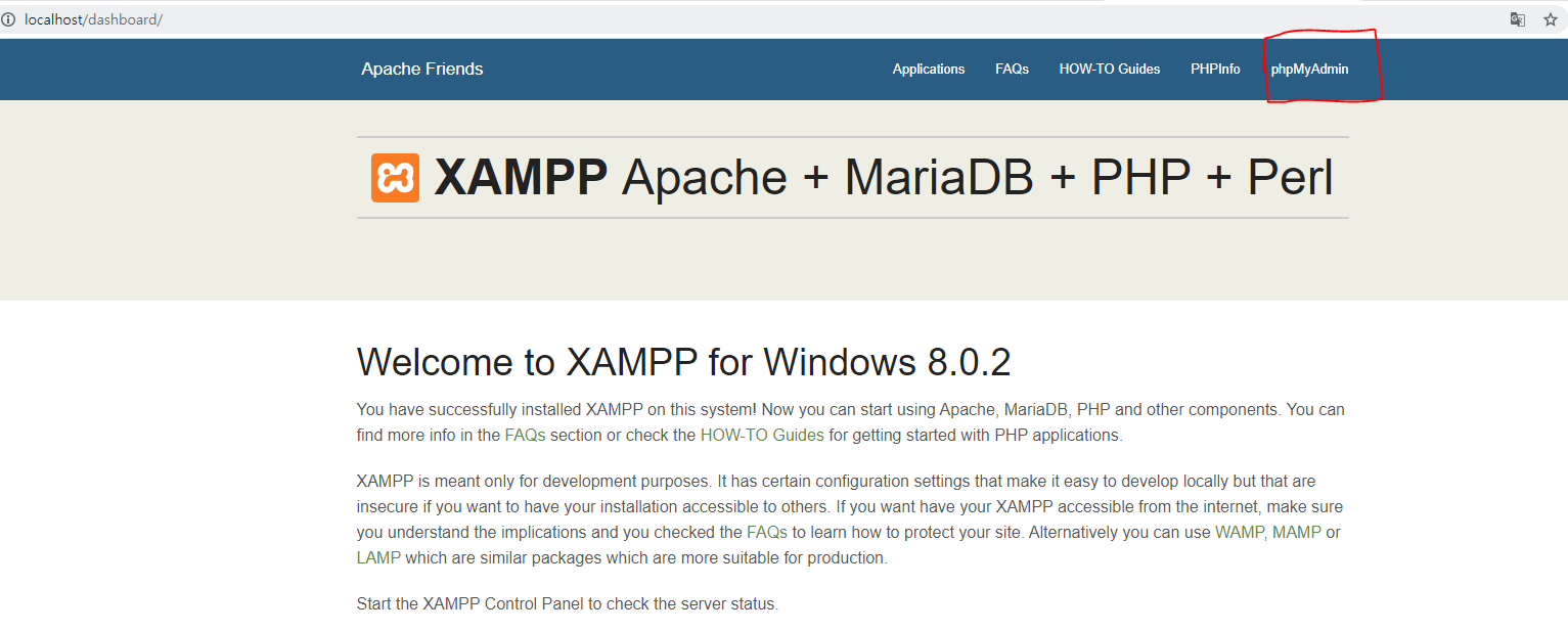 이제 [phpMyAdmin]을 눌러 데이터베이스 관리 페이지에 접속하겠습니다.