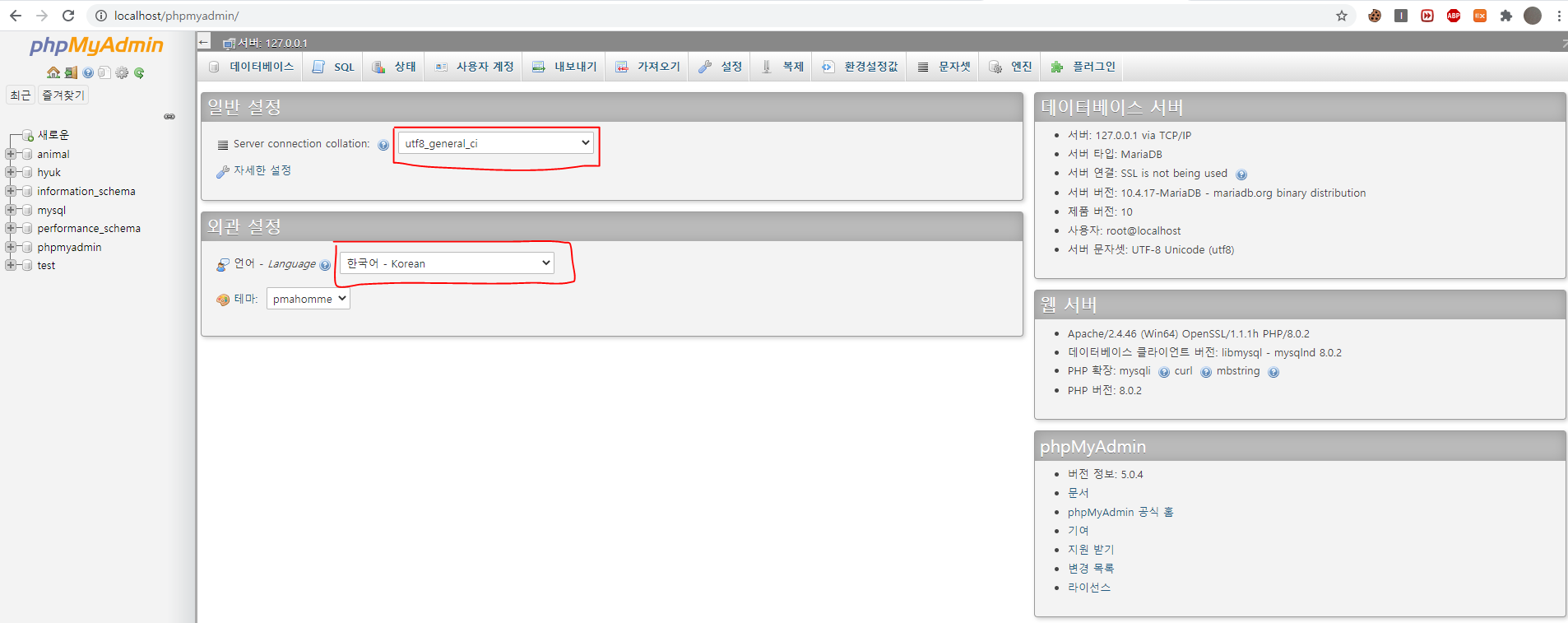 phpMyAdmin에 접속해서 가장 먼저 해줘야 하는 작업은 언어 설정을 한국어로 바꾸는 일입니다.