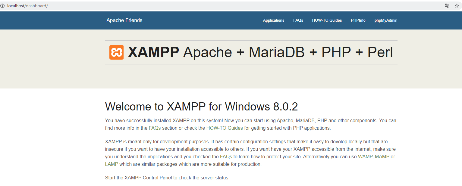 그러면 Apache 관리자 화면이 보이면서 브라우저가 실행됩니다.