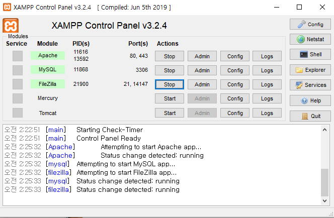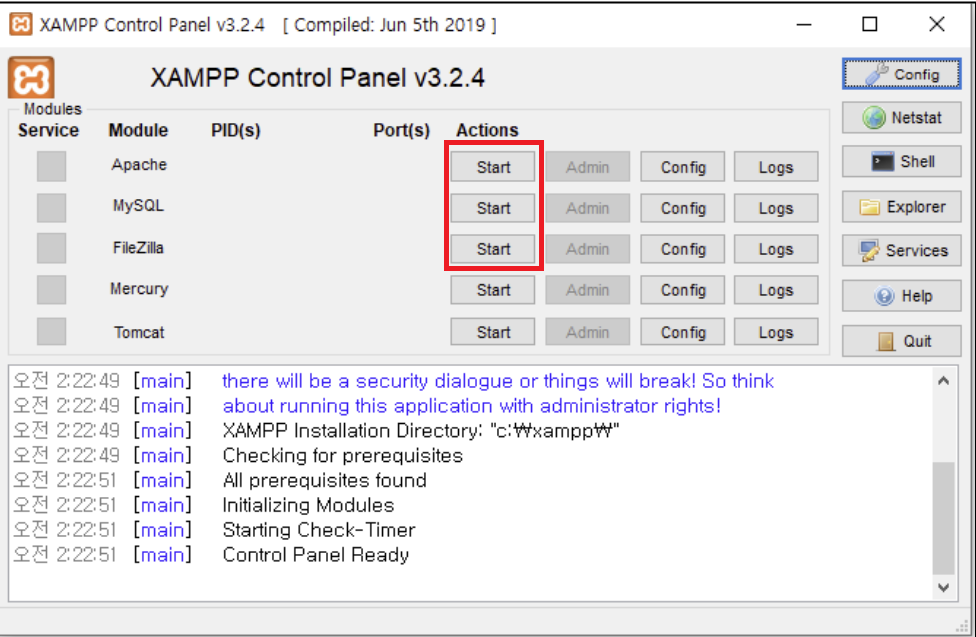 환경을 구성하는데 필요한 [Apache, MySQL, FileZilla]를 Start 합니다.