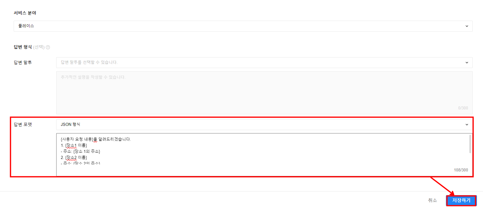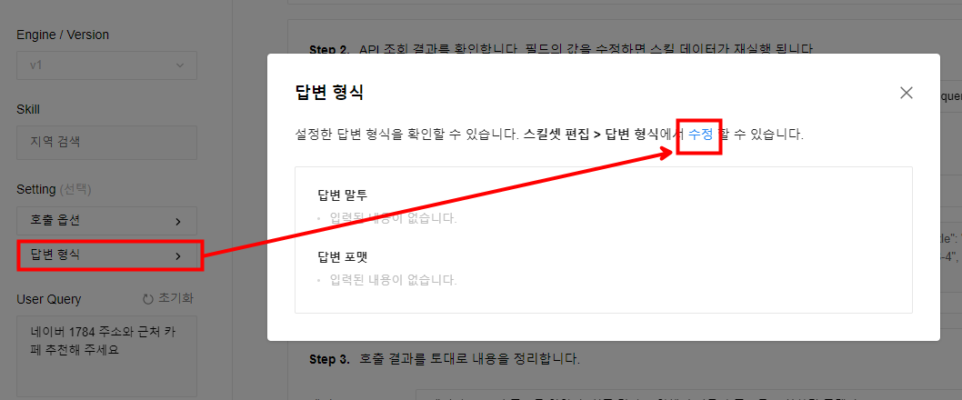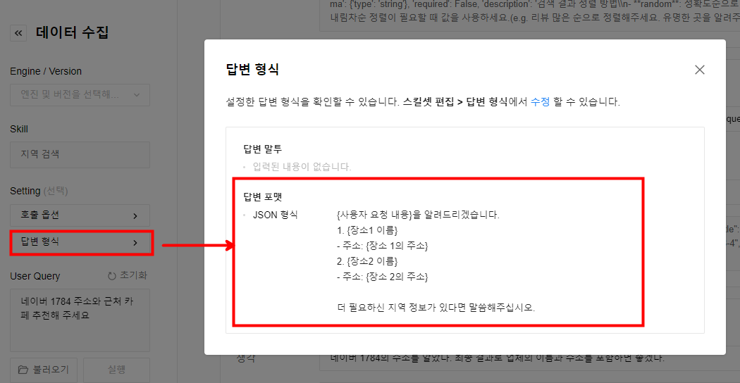 정상적으로 답변 포맷이 수정된 것을 확인할 수 있습니다. 답변 포맷을 수정하기 위해 페이지를 벗어나면 호출 옵션에 지정된 네이버 개발자 API 키가 휘발성으로 없어지기 때문에 새 탭에서 답변 포맷 수정을 진행하시는 것을 권장드립니다.