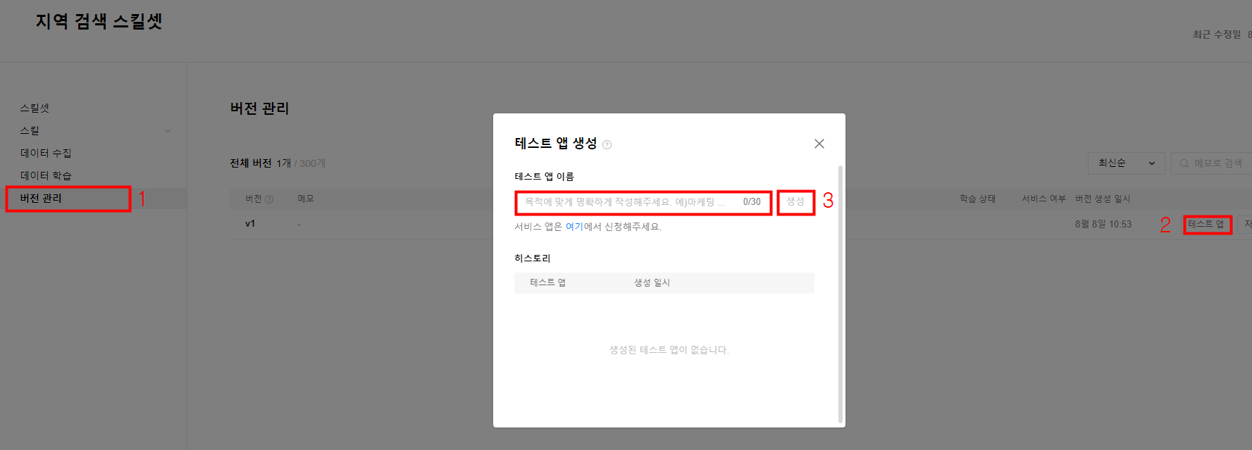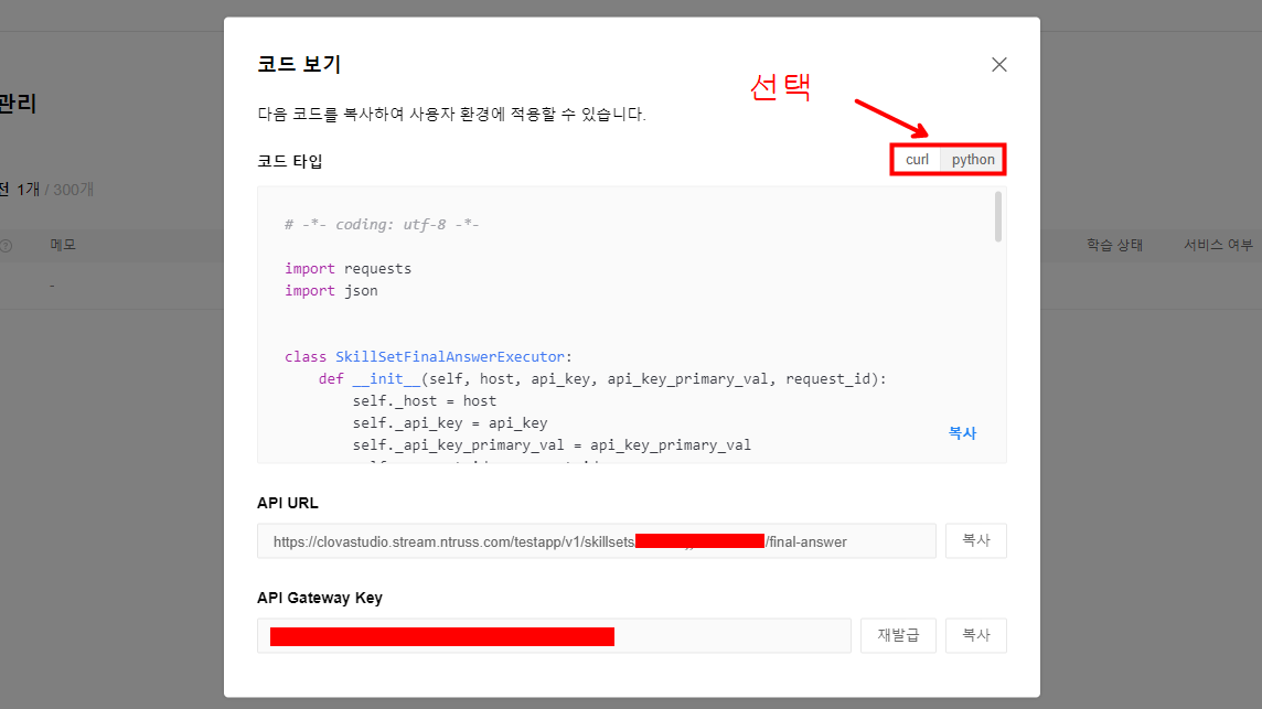 [버전 관리] 탭에서는 스킬에 대한 버전 관리가 가능하며 메모 입력을 통해 해당 버전이 무엇인지 직관적으로 알 수 있게 설계되어 있습니다. 우측에 [테스트 앱]을 누르면 코드에서 사용할 수 있는 curl이나 Python 코드를 자동으로 생성해 주기 때문에 굉장히 편리합니다.