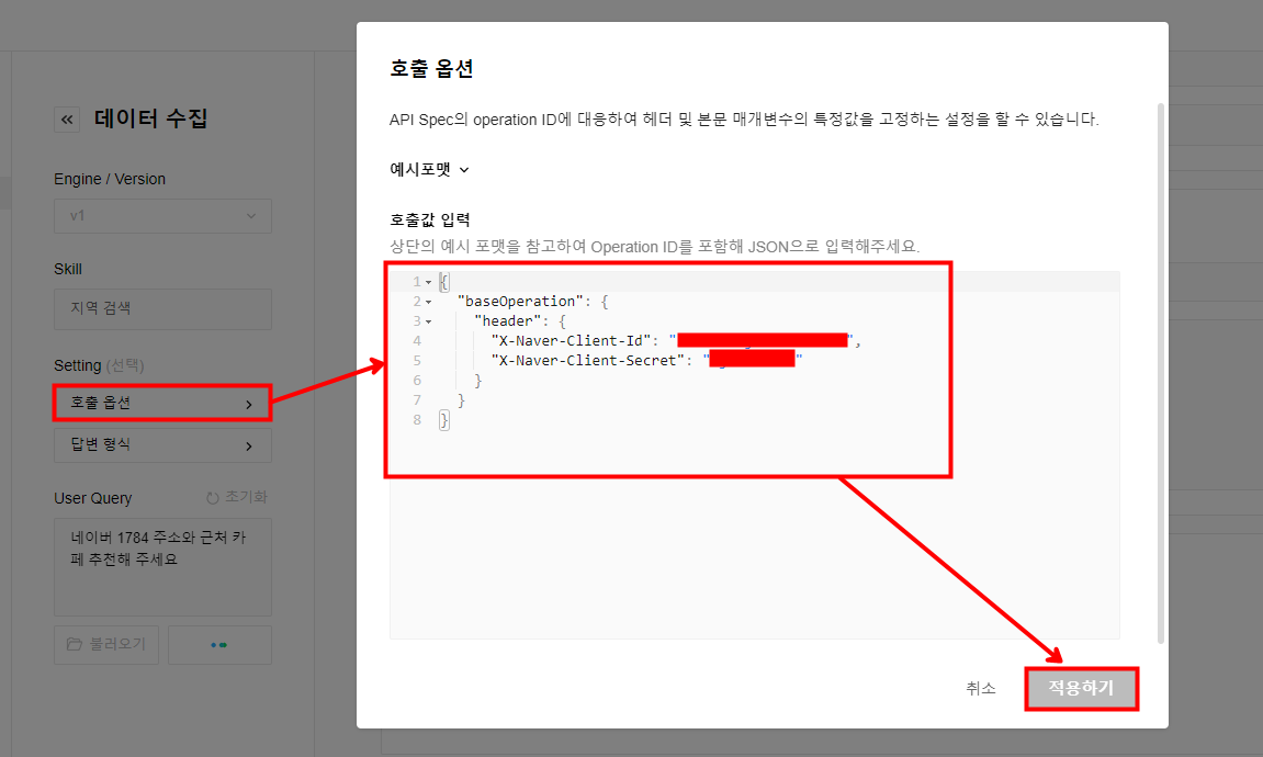 다음과 같이 호출 옵션에 NAVER 개발자 API 키를 입력한 후 적용합니다. 단, 호출 옵션은 휘발성 옵션이기 때문에 키 값이 지속되길 원한다면 [스킬]에서 파라미터 값으로 넣어주는 방법이 있습니다. 별첨에서 따로 설명드리겠습니다.