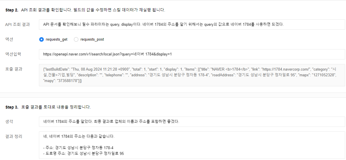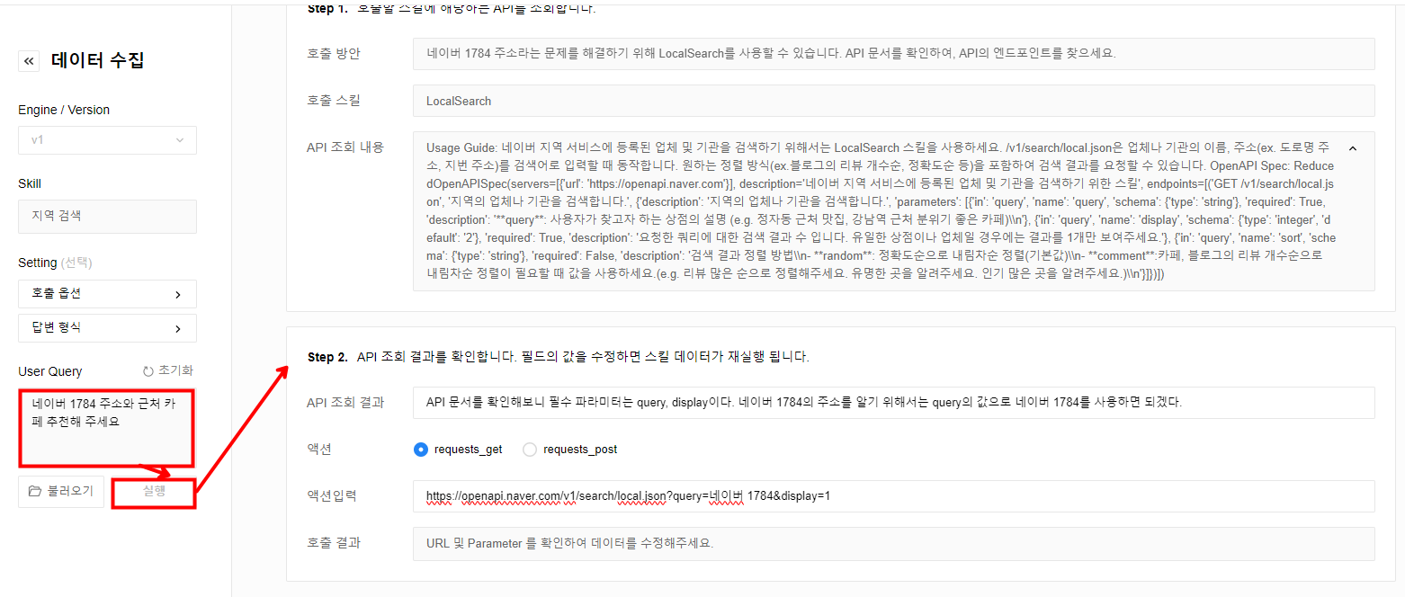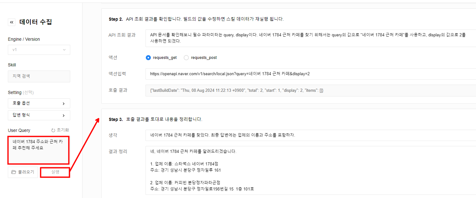 데이터 수집 단계에서는 사용자의 질문을 분석한 후 적절한 스킬을 호출합니다. 쿼리 분석 결과에서 분리된 쿼리의 수만큼 스킬이 호출되는데, 만약 사용자의 질문이 두 개의 쿼리로 분리되었다면 스킬도 각각 두 번 호출하게 됩니다. 이 예제에서는 '네이버 1784 주소와 근처 카페 추천해 주세요'로 데이터를 수집하므로 스킬이 두 번 호출됩니다.