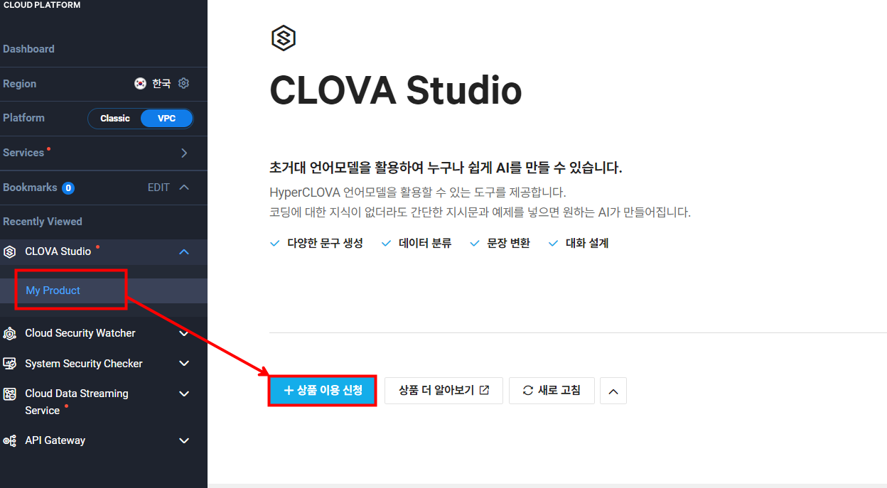 CLOVA Studio - My Product - [상품 이용 신청]을 눌러 서비스 이용을 신청합니다. 신청 및 약관에 동의해 주시면 됩니다.