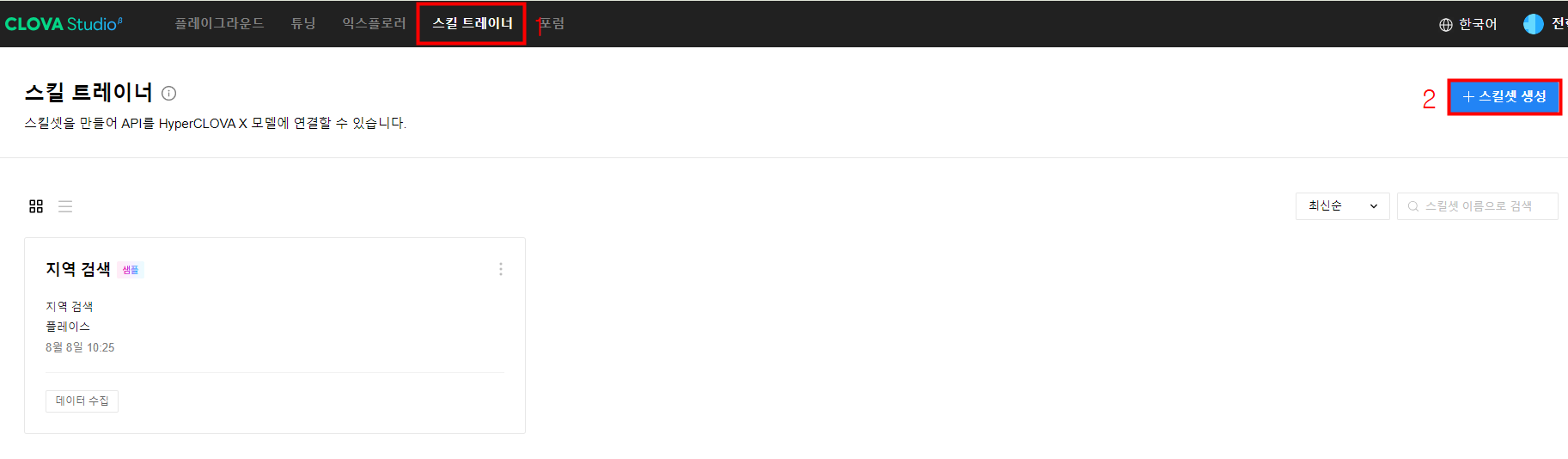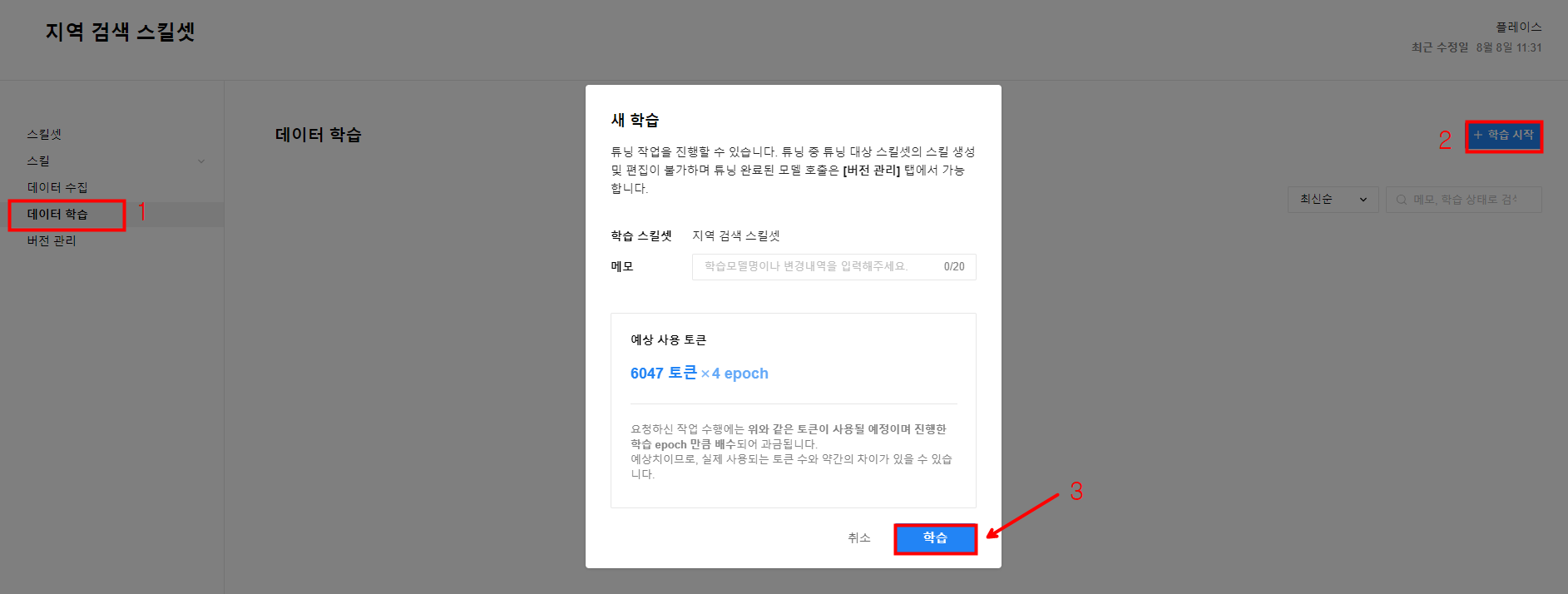 다음과 같이 데이터 학습에서 방금 수집한 내용으로 학습을 진행할 수 있습니다. 이 기능은 HyperCLOVA X의 튜닝 기능과 같습니다.