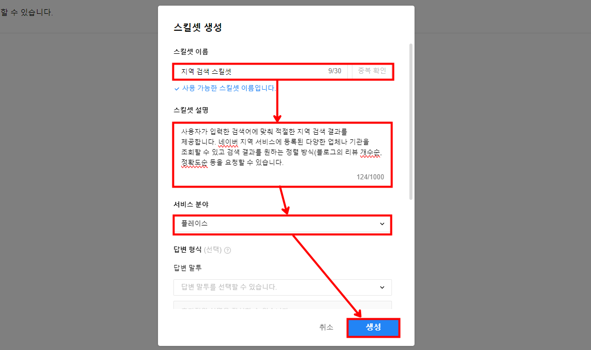 다음과 같이 [지역 검색]으로 테스트 앱을 생성하면 만든 스킬트레이너를 호출할 수 있는 코드와 정보를 자동으로 생성해 줍니다.