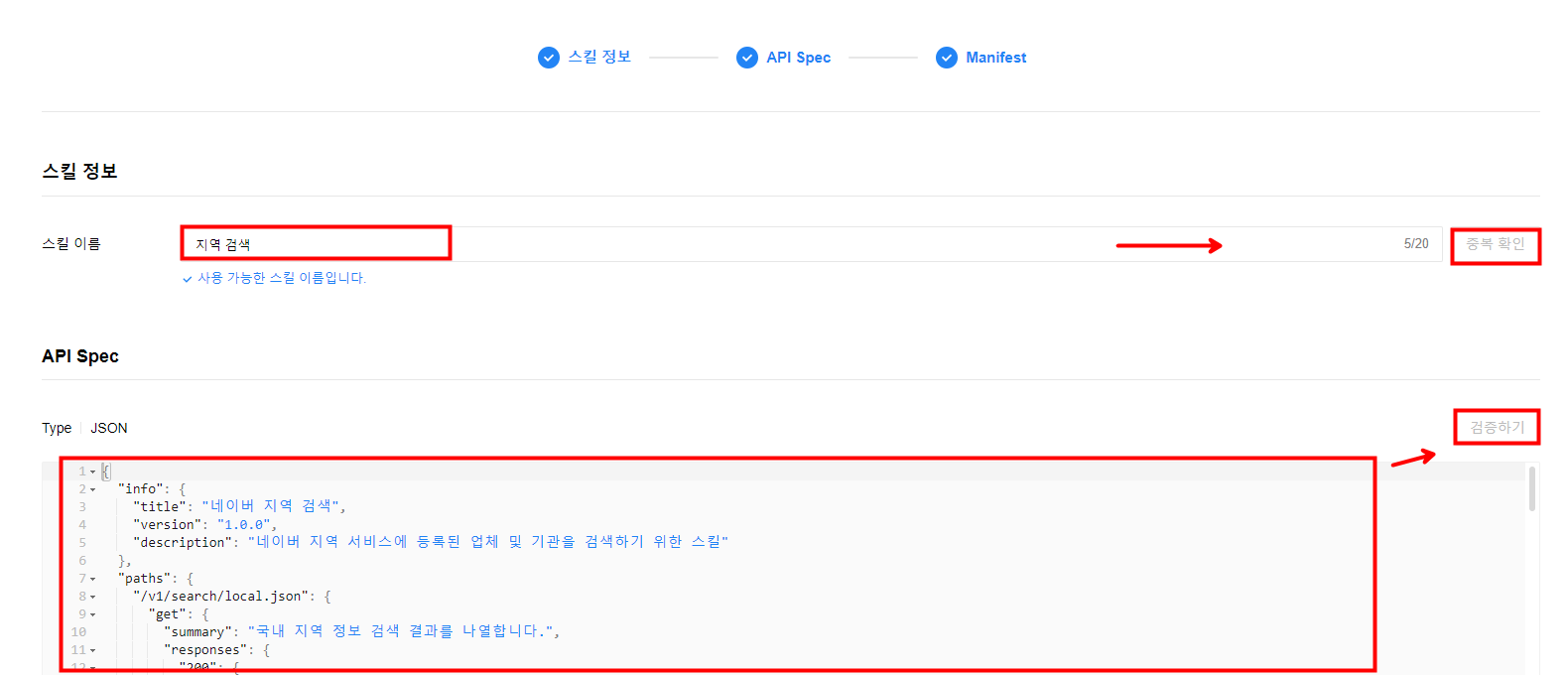 스킬 화면에서 다음과 같이 스킬 이름, API Spec, Manifest에 대한 유효성 검사를 마치면 [생성하기] 버튼이 활성화됩니다. API Spec을 입력한 후 [검증하기]가 비활성화 되어있다면 빈 공간을 클릭해보거나 JSON 문법을 고치면 활성화 됩니다.