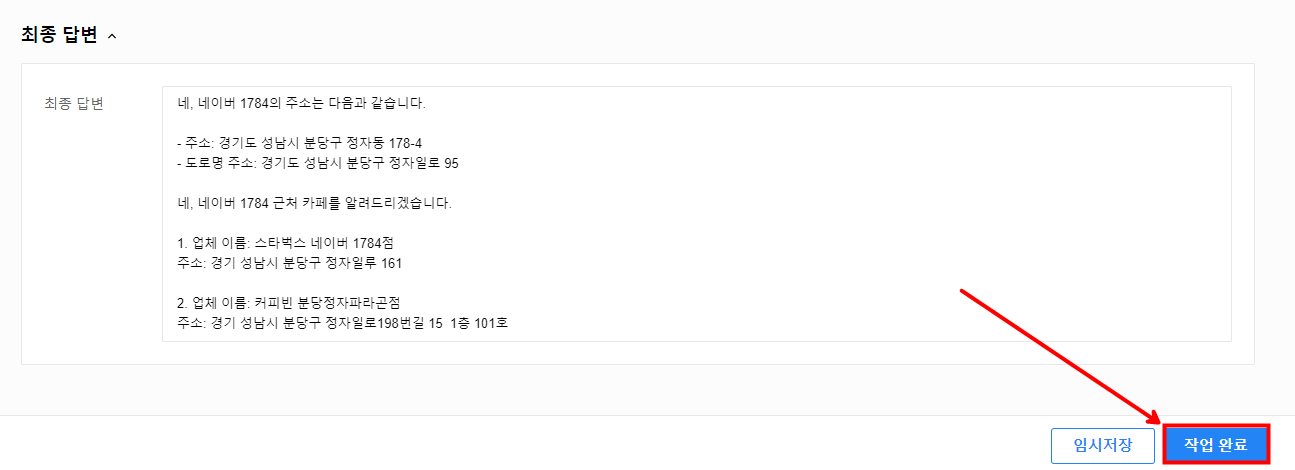 현재 사용자 질의가 "네이버 1784 주소" 그리고 "근처 카페" 두 가지에 대한 질문을 했기 때문에 스킬 트레이너는 다음과 같이 두 질문에 대한 답변을 생성합니다.