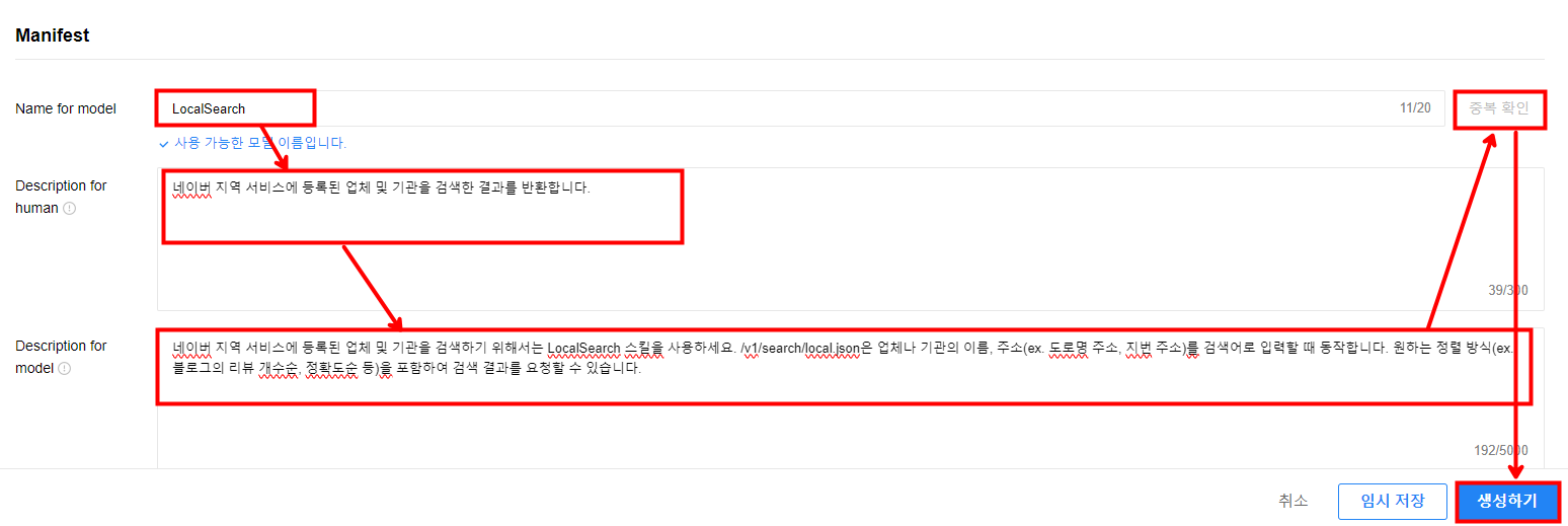 | Description for model | 네이버 지역 서비스에 등록된 업체 및 기관을 검색하기 위해서는 LocalSearch 스킬을 사용하세요. /v1/search/local.json은 업체나 기관의 이름, 주소(ex. 도로명 주소, 지번 주소)를 검색어로 입력할 때 동작합니다. 원하는 정렬 방식(ex.블로그의 리뷰 개수순, 정확도순 등)을 포함하여 검색 결과를 요청할 수 있습니다. |