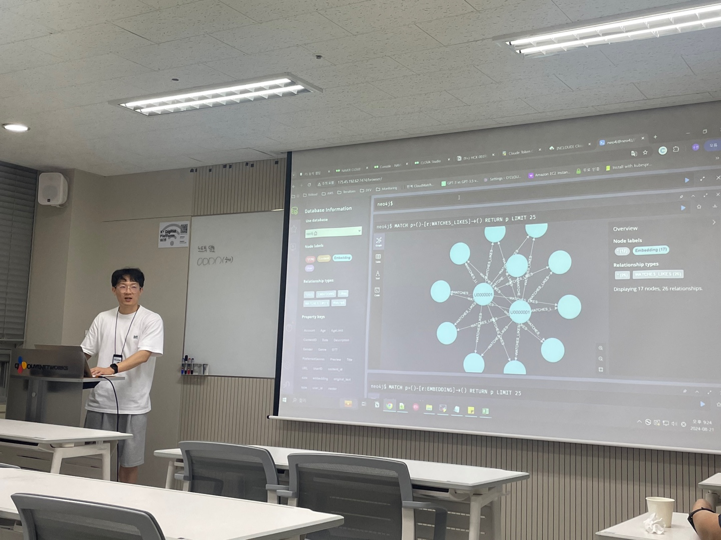 마지막 발표는 네트워킹 시간에 Manvscloud 김수현님이 최근에 AI 학습하면서 진행한 Neo4j를 활용한 서비스 구현 과정에 대해 설명해 주셨습니다. 저는 아직 RAG에서 VectorDB도 생소한 느낌인데 Neo4j와 GraphDB를 이용해서 서비스 구현하는 과정과 멀티 LLM을 사용해서 쿼리를 가져오고 튜닝해서 사용하는 고급 AI 기술에 대해서 소개해주었습니다.