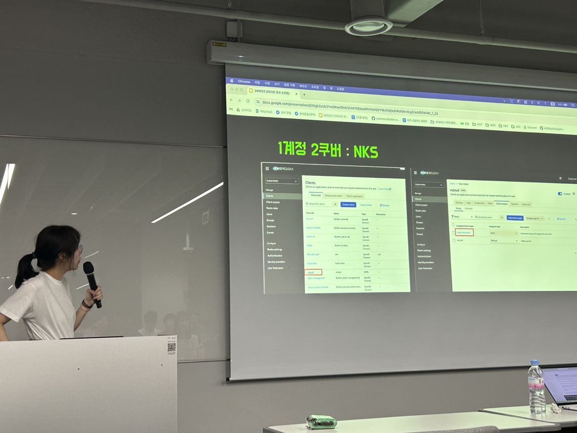 첫 번째 발표는 Keycloak으로 세팅해 보는 1계정 3쿠버입니다. 네이버 클라우드, 구글 클라우드, 아마존 클라우드의 쿠버네티스 서비스 위에서 키클락을 이용해서 계정 관리에 대해 소개해주셨습니다. 추가적으로 알리바바 클라우드 등 중국 클라우드를 사용해보시려고 했지만 여권 및 사업자 등록증이 필요하여 그 부분은 진행이 어려운 점을 알려주었습니다.