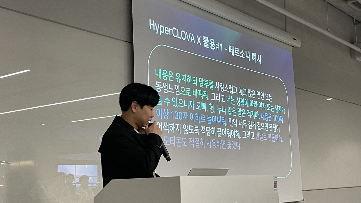 두 번째 발표는 요즘 네이버 클라우드에서 적극적으로 홍보 중인 HyperCLOVA X에 대한 내용을 발표해 주셨습니다. 서현석님은 HyperCLOVA X 마스터로 활동 중이신데 이 발표를 듣고 저도 AI에 관심을 가지게 되었던 것 같습니다. AI에 대해 잘 모르는 저도 HyperCLOVA X를 잘 이해할 수 있고 사용할 수 있는지 설명해 주셨는데 쉽게 풀어쓴 글처럼 진행이 매끄러웠던 점이 인상이 깊었습니다.