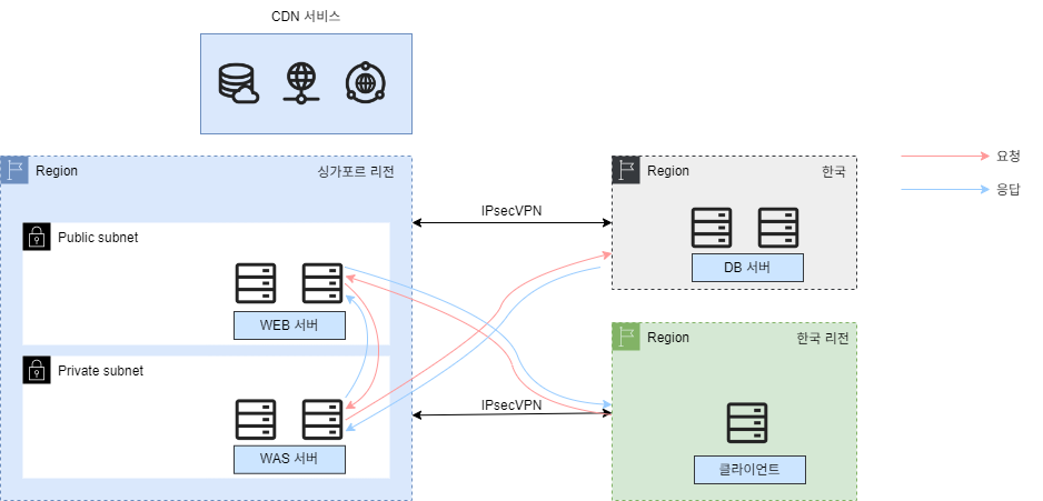 현재 인프라 구성 상 싱가포르 리전과 국내 IDC 환경이 IPsecVPN으로 연결되어 있고 싱가포르 리전과 한국 리전 역시 IPsecVPN으로 연결되어 있습니다. 앞선 요구사항으로 국내 IDC에는 DB 서버를 싱가포르 리전에는 WEB/WAS 서버를 배치하였습니다.