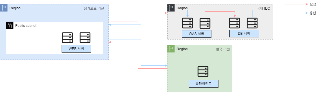 최근 가상의 서비스 사업자는 한국에서의 사업을 글로벌 사업으로 확장하며 싱가포르에 인프라를 구성하였습니다. 사업자는 유연하고 탄력적인 인프라 환경을 원하여 퍼블릭 클라우드에 서비스를 구성하였고 자체 IDC를 보유하고 있어 민감한 정보가 있는 DB 서버는 IDC에 구성되길 희망합니다.